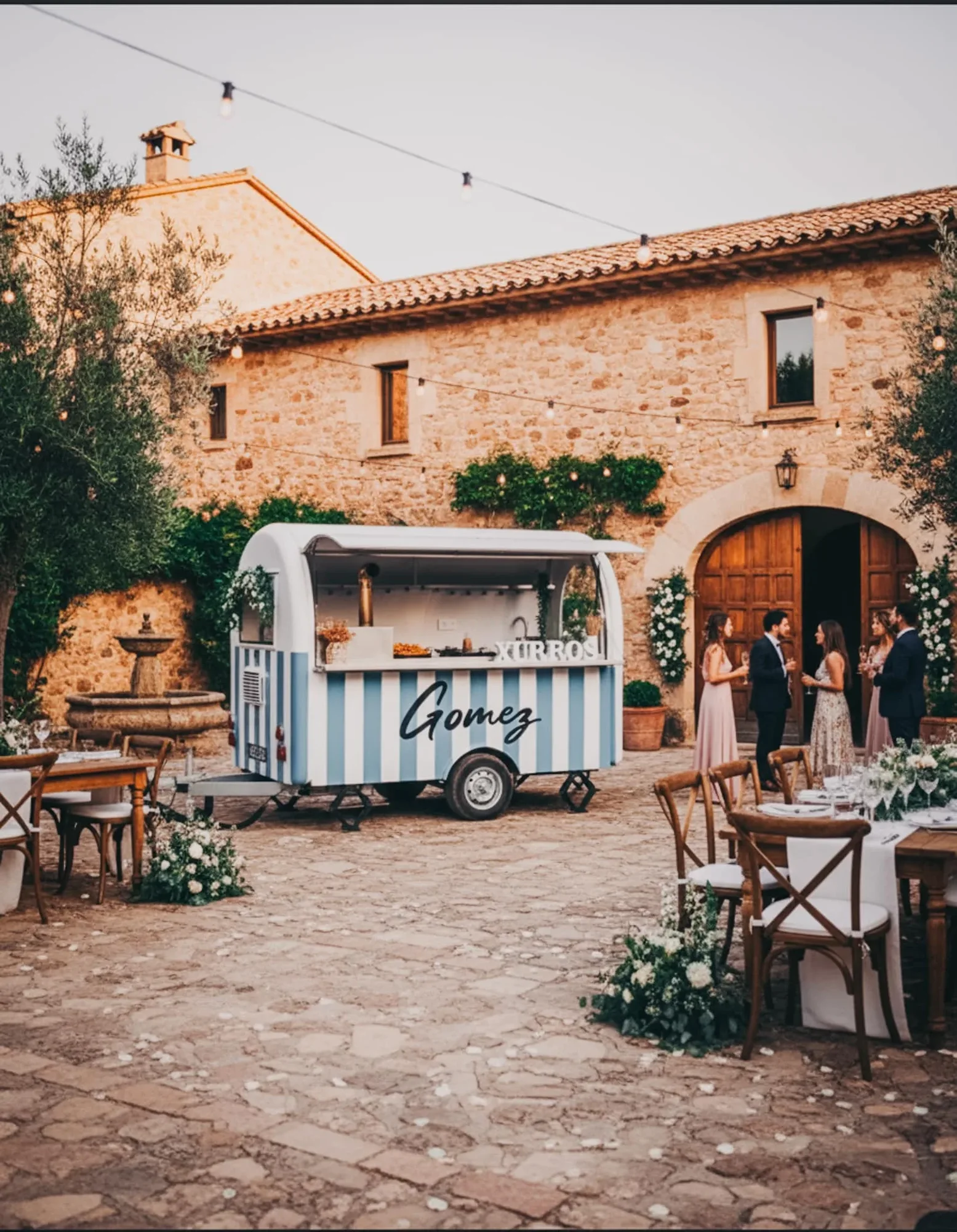 ¿Te imaginas el olor a churros recién hechos a medianoche mientras tus invitados bailan? Nuestro food truck lleva una churrería artesanal completa a tu boda: churros crujientes, chocolate caliente premium y un rincón mágico que sale en todas las fotos.